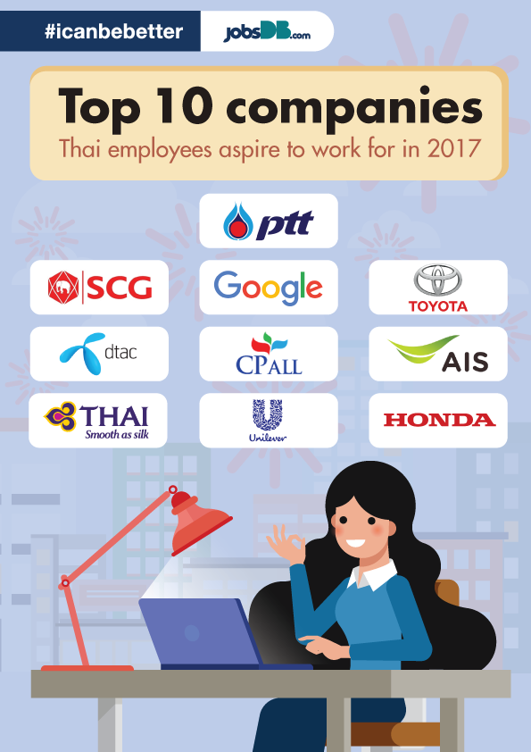 Bangkok, Thailand 9 November 2017 - jobsdb (Thailand) Company Limited, which has operated one of Asia’s leading job websites, today reveals the top 10 most aspired companies among Thais. Occupying the first two places on this employers of choice ranking are Thai companies. The list also reflects that technology, digital, automotive and telecom companies have still been Thai employees’ favorites. To get talented employees, employers are advised to develop not just quality corporate culture but also the right attitudes.