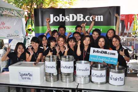 jobsdb.com ห่วงใยพี่น้องผู้ประสบอุทกภัย จึงขอเป็นหนึ่งในองค์กรที่มีส่วนร่วมในการช่วยเหลือสังคม โดยร่วมกับ 88DB.com และ Hydro Health จัดกิจกรรม “jobsdb.com รวมน้ำใจสู้ภัยน้ำท่วม” โดยกิจกรรมดังกล่าวเป็นการเลี้ยงอาหารกลางวันเพื่อช่วยเหลือและสร้างกำลังใจแก่ผู้ประสบอุทกภัยประมาณ 1,300 คน ที่พักอยู่ ณ ศูนย์พักพิง ราชมังคลากีฬาสถาน หัวหมาก ในวันพุธที่ 23 พฤศจิกายน 2554 ตั้งแต่เวลา 11.00-13.30 น.ผู้พักพิงจะได้อิ่มอร่อยกับเมนูอาหารที่มีให้เลือกทั้ง เซียงไฮ้ขี้เมาไก่ หรือข้าวน้ำพริกปลาทูป่นพร้อมผักสด ตามด้วยเครื่องดื่มดับกระหายคลายร้อนไม่ว่าจะเป็นน้ำสมุนไพร หรือชาเย็น ตบท้ายด้วยไอศกรีมอร่อยเย็นชื่นใจ นอกจากนี้ยังมีกระเป๋าผ้าลดโลกร้อน jobsdb.comมาแจกอีกด้วย
