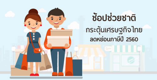 ช้อปช่วยชาติ กระตุ้นเศรษฐกิจไทยช่วงปลายปี 2560 ลดหย่อนได้ตามจำนวนที่จ่ายจริง แต่ไม่เกิน 15,000 บาท สำหรับเงินได้ที่ได้จ่ายเป็นค่าซื้อสินค้าหรือค่าบริการให้แก่ผู้ประกอบการที่จดทะเบียนภาษีมูลค่าเพิ่ม ระหว่างวันที่ 11 พฤศจิกายน - 3 ธันวาคม 2560