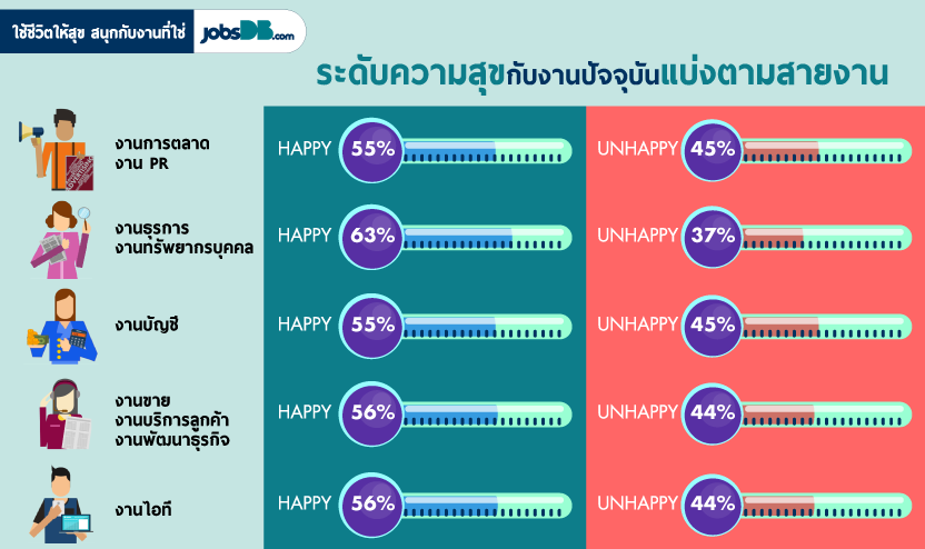 สายงานที่ทำแล้วมีความสุขมากที่สุด คือ งานธุรการและงานบุคคล ซึ่งมีระดับความสุขมากถึง 63% เมื่อเทียบกับกลุ่มคนที่ทำงานการตลาด งาน PR งานบัญชี งานขาย งานบริการลูกค้า งานพัฒนาธุรกิจ และงานไอที ซึ่งมีค่าเฉลี่ยของความสุขอยู่ที่ 50%