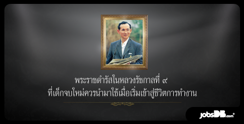 Jobsdb ขอน้อมรำลึกในพระมหากรุณาธิคุณอันหาที่สุดมิได้ ของในหลวงรัชกาลที่ ๙ พระมหากษัตริย์ที่ทรงปกครองประชาชนด้วยทศพิธราชธรรม อีกทั้งยังทรงเป็นพระราชาที่เปี่ยมไปด้วยพระปรีชาสามารถ เป็นแบบที่ดีในการดำเนินชีวิตของประชาชนชาวไทยมาจนถึงปัจจุบัน รวมไปถึงเรื่องของการทำงาน ซึ่งในสมัยที่พระองค์ทรงเสด็จไปยังงานพิธีต่างๆ ก็ทรงมีพระราชดำรัส พระบรมโชวาทต่างๆ เป็นข้อคิดให้แก่เหล่าข้าราชบริพารและประชาชนที่มาเข้าเฝ้าฯ มากมาย จนกลายมาเป็นข้อคิดและคติเตือนใจ ให้ทุกคนสามารถนำมาปรับใช้ในชีวิตการทำงานได้