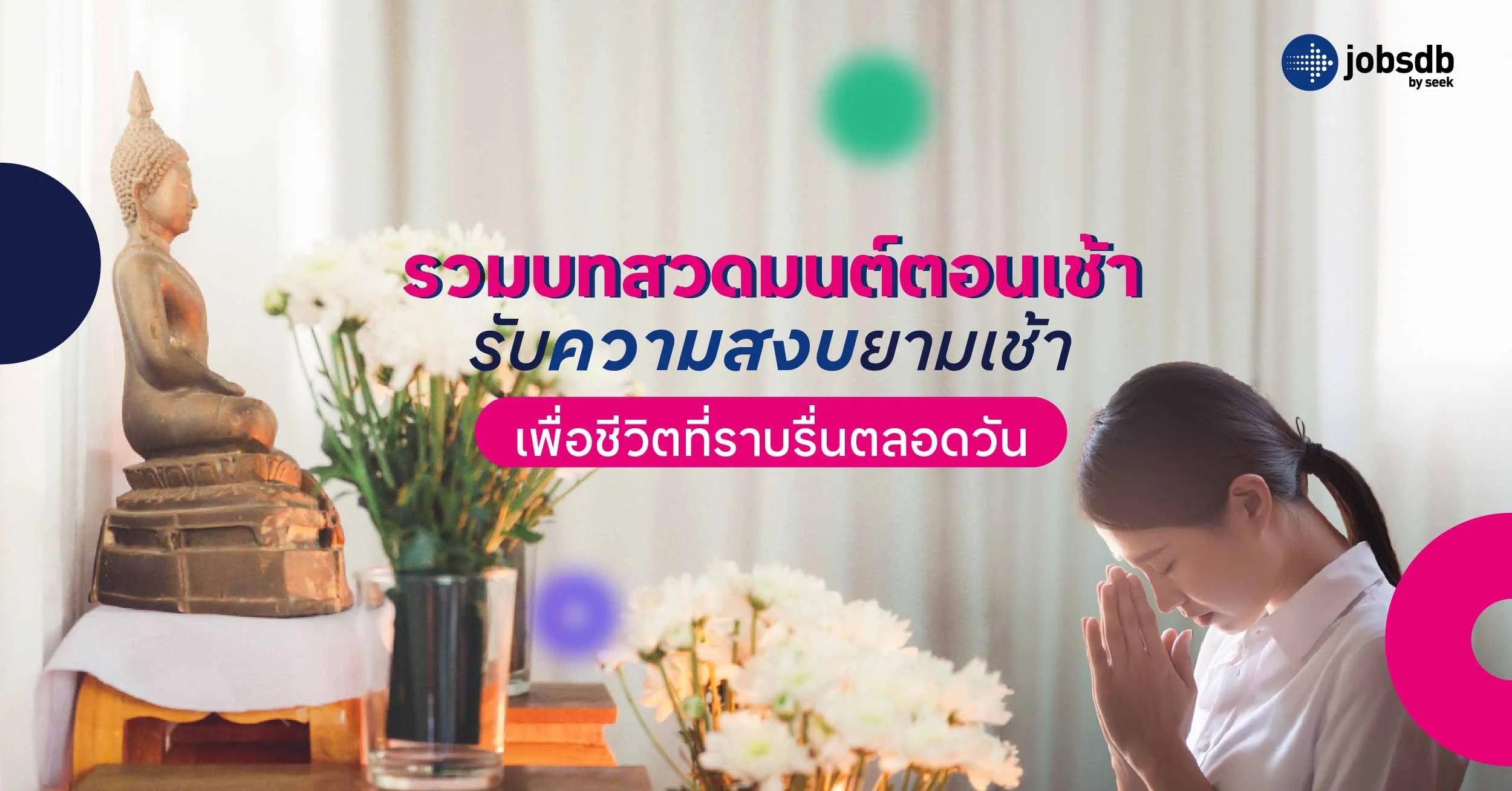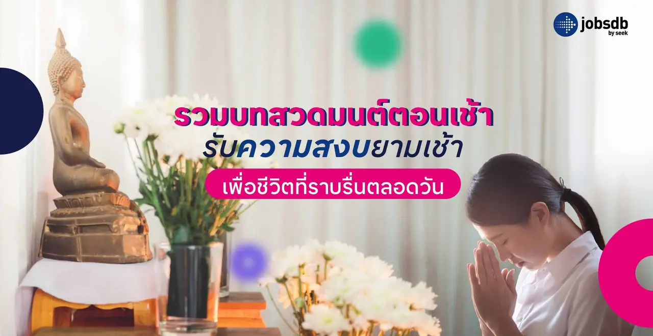 การสวดมนต์ตอนเช้าช่วยให้จิตใจสงบมากขึ้น ลองสวดมนต์ก่อนไปทำงาน เพื่อให้การทำงานราบรื่นมากขึ้น เพราะจิตที่มั่นคงจะทำให้มีสติในการใช้ชีวิต ใครกำลังมองหางานที่มั่นคงหรืออยากมีการเงินที่มั่นคง ให้ Jobsdb เป็นตัวเลือกในการหางาน เพราะที่นี่มีบริการครบครันทุกเรื่องการหางาน พร้อมให้ได้สำรวจอาชีพ เปรียบเทียบเงินเดือน ระบุประเภทงานที่ต้องการทำ เพียงไม่กี่ขั้นตอนก็ช่วยให้ได้งานที่อยากทำแล้ว