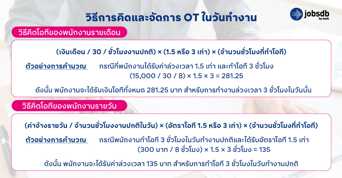 ส่วนวิธีการคิดโอทีสำหรับพนักงานรายวันจะคำนวณจากอัตราค่าจ้างรายวัน โดยพิจารณาจากจำนวนชั่วโมงการทำงานที่เกินเวลาปกติในวันทำงาน ตามสูตรดังนี้