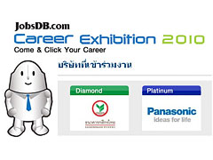 มหกรรมสมัครงานออนไลน์ของจ๊อบส์ดีบีประสบความสำเร็จอย่างต่อเนื่องยาวนาน ไม่ว่าจัดกี่ครั้งก็ได้รับการตอบรับจากบริษัทชั้นนำเป็นอย่างดี หากคุณเป็นคนหนึ่งที่กำลังหางาน ขอเชิญมาสัมผัสระบบการสมัครงานที่รวดเร็ว ไฮเทคที่สุดในประเทศ พร้อมพบกับบริษัทชั้นนำที่คุณใฝ่ฝันได้ที่งาน Career Exhibition 2010 รวบรวมตำแหน่งงานกว่า 10,000 ตำแหน่งจากบริษัทชั้นนำนับร้อยบริษัท มาให้คุณสมัครงานอย่างจุใจ อาทิ