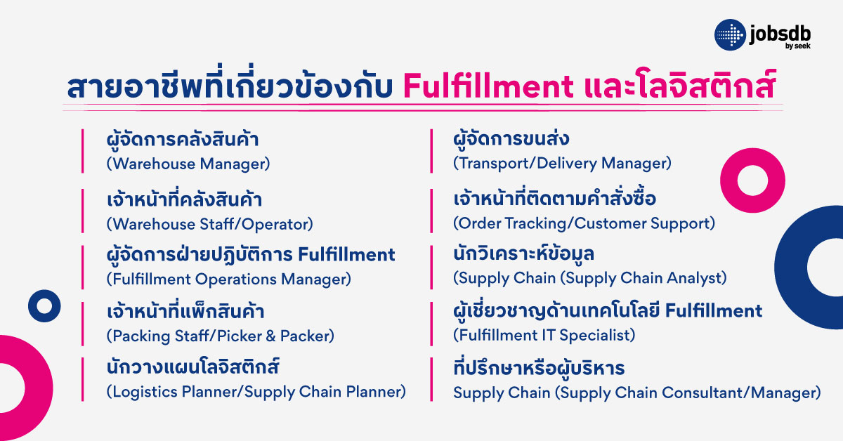 งานด้าน Fulfillment มีหลากหลาย ทั้งการจัดการคลังสินค้า แพ็กสินค้า จัดส่ง และติดตามคำสั่งซื้อ ในปัจจุบัน E-commerce เติบโตต่อเนื่อง ทำให้ตำแหน่งงานสายนี้มีความต้องการสูง