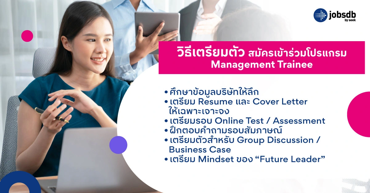 สามารถสมัครได้ผ่านแพลตฟอร์มหางานผ่าน Jobsdb ที่รวมตำแหน่ง Management Trainee จากหลายบริษัทชั้นนำ ทำให้ค้นหาและสมัครได้สะดวก