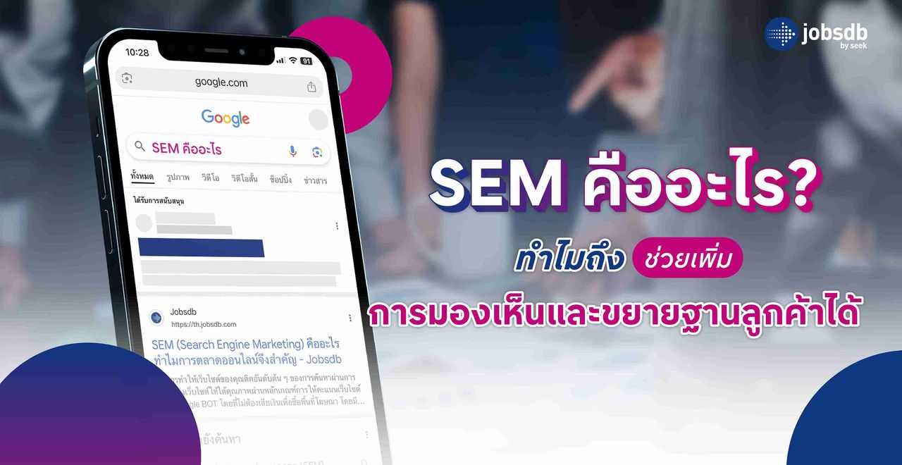 SEM เป็นเครื่องมือการตลาดแบบดิจิทัลที่มีประสิทธิภาพ มีลักษณะคล้ายกับเรซูเม่สมัครงานหากใช้ประโยชน์ได้อย่างถูกต้องก็จะทำให้เติบโตได้อย่างมีประสิทธิภาพ จึงทำให้หลากหลายธุรกิจในปัจจุบันนิยมใช้เครื่องมือ SEM กันมากขึ้นเพราะถือว่าเป็นเครื่องมือที่ทรงพลังในการเพิ่มการมองเห็นเว็บไซต์หรือธุรกิจของคุณให้ไปถึงกลุ่มเป้าหมายได้อย่างมีประสิทธิภาพ จากนี้ไปเราจะมาดูกันว่า SEM คืออะไรและช่วยเพิ่มการมองเห็นและขยายฐานลูกค้าได้อย่างไรบ้าง!