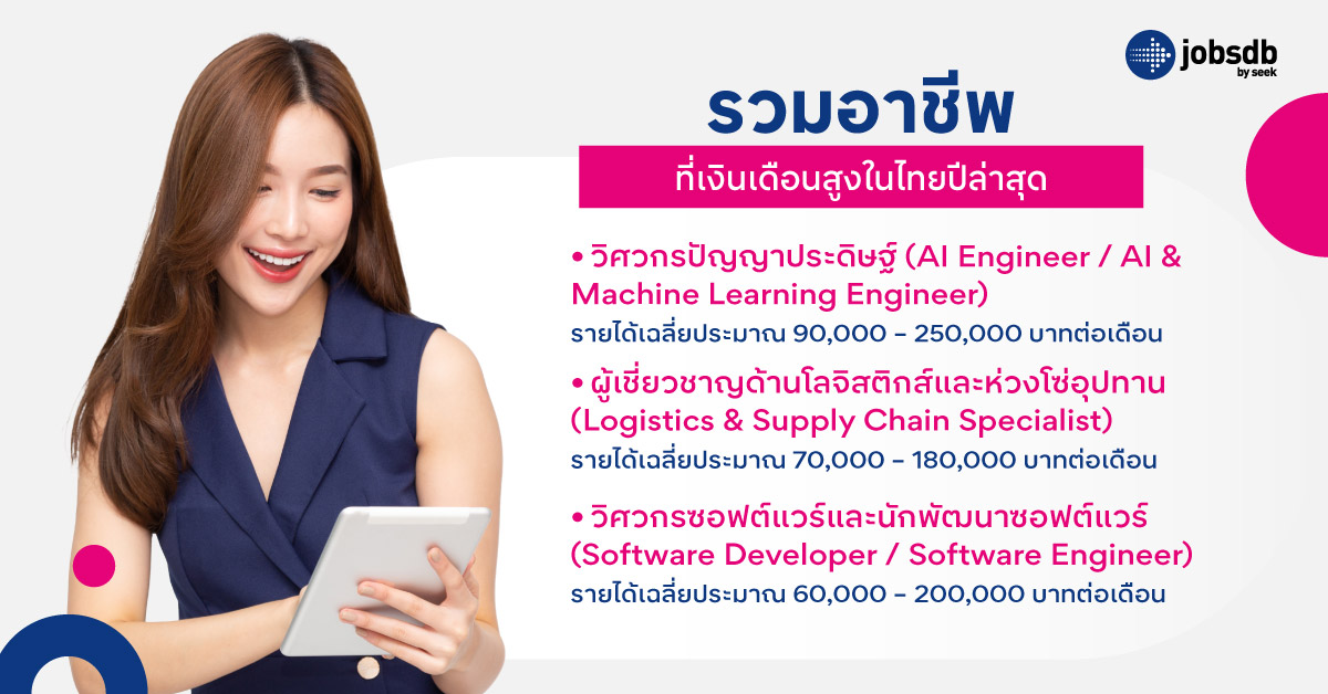 อาชีพที่เงินเดือนสูงโดดเด่น เช่น ผู้บริหารระดับสูง แพทย์ผู้เชี่ยวชาญ ผู้เชี่ยวชาญด้านเทคโนโลยีดิจิทัล (AI, Data, Cybersecurity) และสายงานการเงินการลงทุน ซึ่งยังคงครองตำแหน่งรายได้สูงสุด